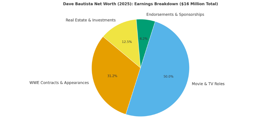 Dave Bautista’s net worth is estimated to be around $16 million. This wealth is primarily generated from his successful wrestling career, acting roles, endorsements, and various business ventures. Bautista’s earnings have grown significantly, especially with his transition into film, where he has landed roles in major franchises, including Marvel’s Guardians of the Galaxy and Dune.